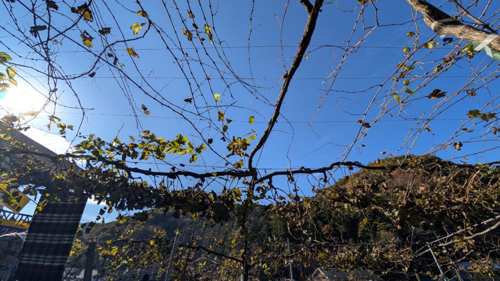 青空の下、収穫が終わった葡萄畑を見上げてみる