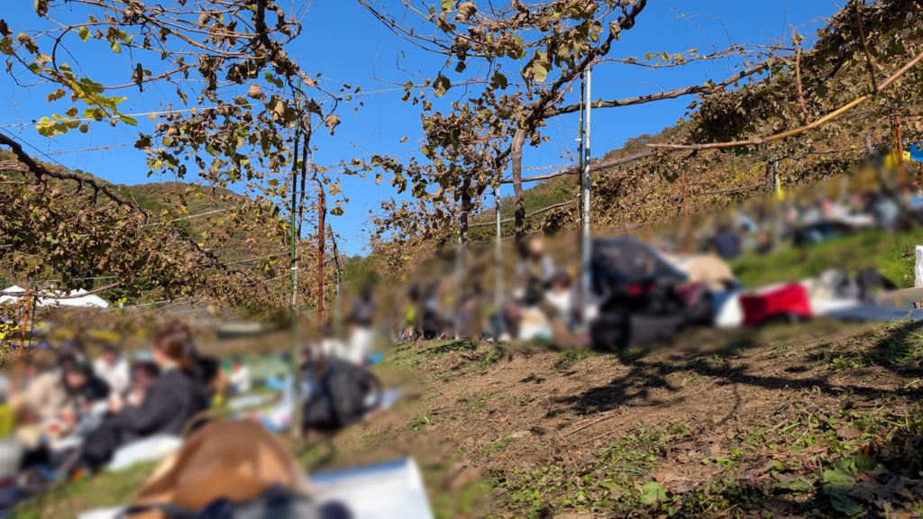 既に沢山のゲストの皆さんが来場済みで、葡萄畑のほとんどの場所が埋まっており、なかなか座る場所が見つかりません…。