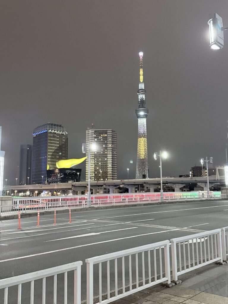 お馴染みアサヒビールのオブジェとスカイツリーが並びで見える、これぞ東京という雰囲気。