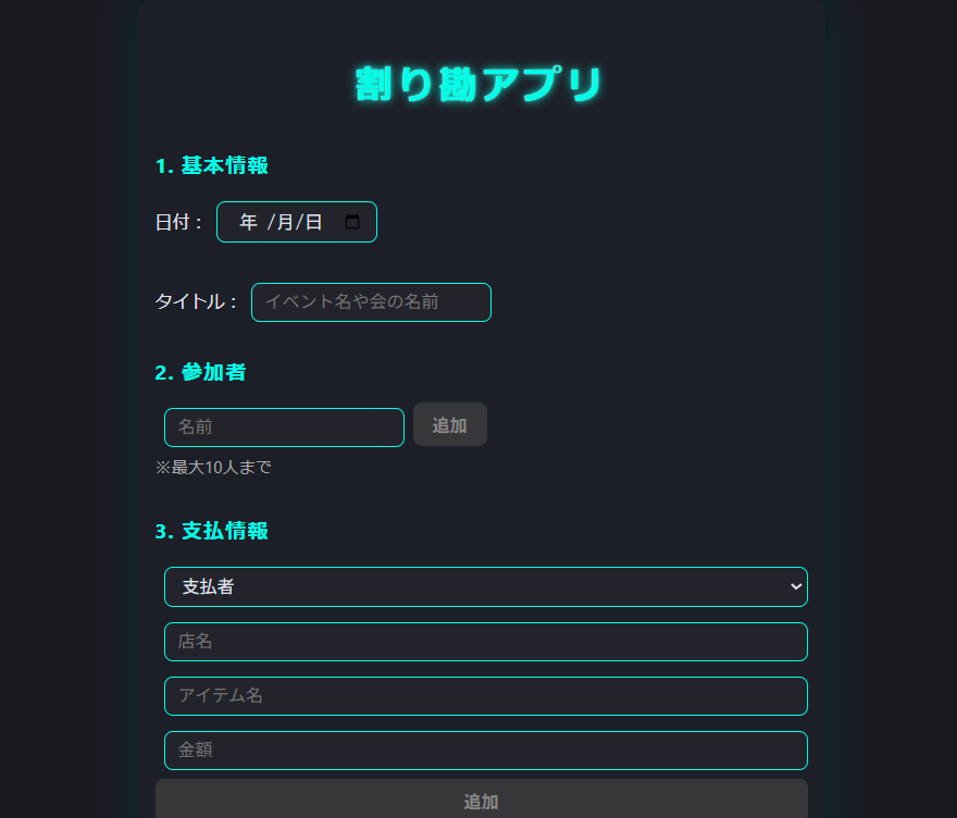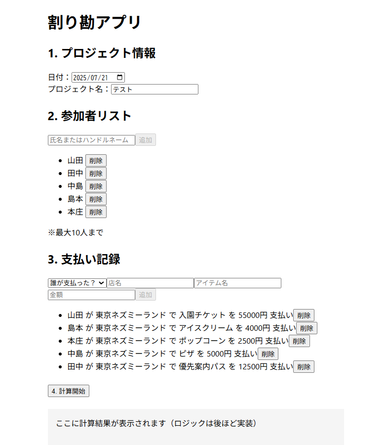 この時点では、まだ登録されたデータから割り勘の金額を計算するためのロジックは実装されておらず、あくまで外枠のみ作成されている状況です。