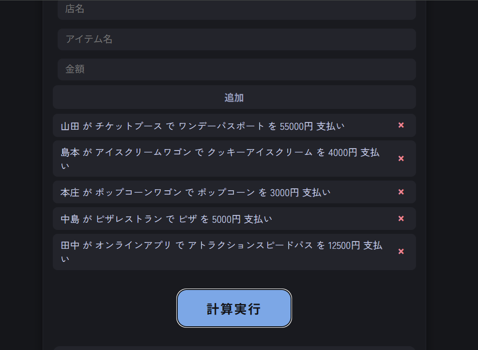 3. 支払い記録の入力(誰が・店名・アイテム名・金額、追加・削除)