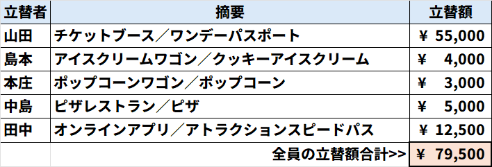 最初に、各々が立て替えた金額の合計が正しいかどうかを確かめます。