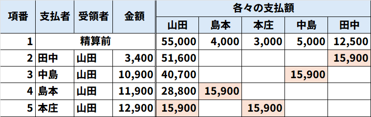 ここから、算出された結果をもとに全員が¥15,900円支払った状態にあるかを確かめます。