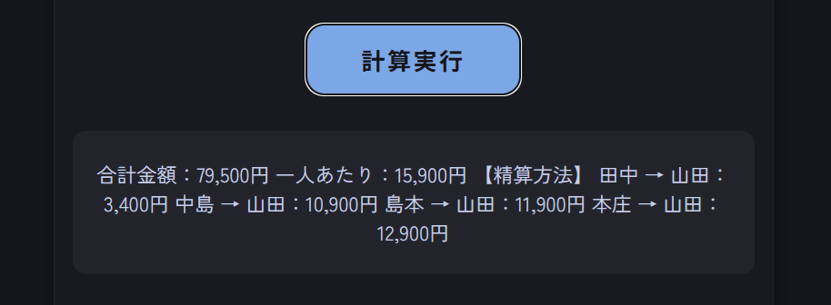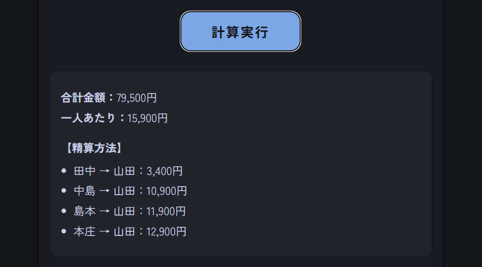 - 最終的に「誰が誰にいくら支払えば精算できるか」を算出