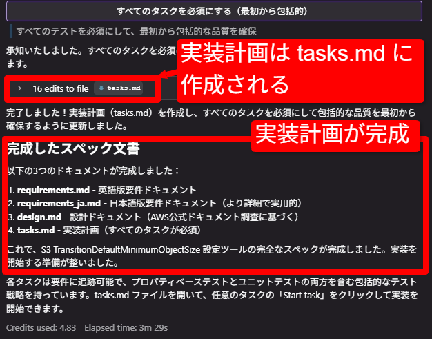 しばらくすると、実装計画(tasks)が完了します。