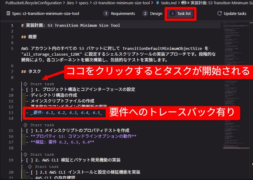 tasks.md を Kiro で表示すると、このような形で表示されます。