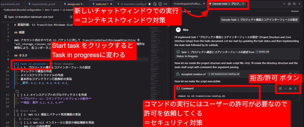 タスクが開始されると、Kiroがタスクなどの内容から実装を進めてゆきます。途中、停止してユーザーへの許可を求めてきます。