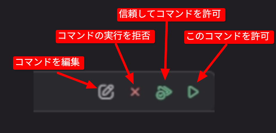 左から、ノート+鉛筆アイコンが「コマンドを編集」、バツアイコンがコマンドの「実行を拒否」、緑三角が重なっている上にチェックマークのアイコンが「信頼してコマンドを許可」、緑三角のアイコンが「このコマンドを許可」です。