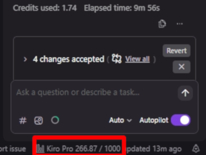 下の画像は今回の実装で使った Kiro クレジットは 266.87 でした。 Kiro Pro プラン(20USD/月) の上限が 1000 クレジットなので、一月にSpecモードを使ってツール4つ開発するとKiro Pro では収まらなさそうということになります。仕事で Vibeモードのみの場合、かなり質問を投げたつもりだったのですが、600クレジット/月くらいの消費が最大だったことを考えると、 Specモードでバリバリ開発するとなるとその上の Kiro Pro+(40USD/月) が必要になりそうです。