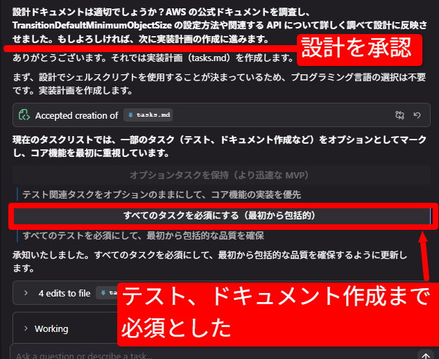 設計ドキュメントの承認とタスクのオプション選択
